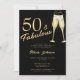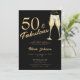 Moderno falso roteiro de caligrafia de ouro 50 anos e fabuloso convite de aniversário negro com flautas de champanhe.