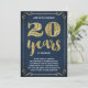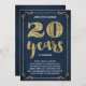 Este convite de festa de aniversário de casamento de 20 anos, sofisticado e elegante, apresenta tipografia vintage, floreios elegantes, caligrafia de pincel, folha dourada falsa e um fundo azul naval chic.