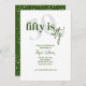Tipografia em negrito com caligrafia 50 é um convite de festa de aniversário bacana em verde e branco. O verso apresenta um fundo totalmente verde com manchas/bolhas brancas para imitar as bolhas no vinho e champanhe para celebrar como envelhecemos como um vinho fino. Todo o texto é completamente personalizável.