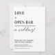 Vai ser casual ou informal? Use este convite de casamento preto e branco engraçado com Love + Open Bar = um casamento! Adicione nomes, localização e seus detalhes para convidar as pessoas para ajudá-lo a celebrar seu dia especial. Veja a coordenação de itens no nosso compro, Encantado Finch.