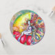 Colorida, caprichosa fada sentada em uma flor vermelha em faíscas douradas e cores vibrantes. Pintura acrílica com folha dourada e prateada com cores iridescentes.