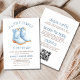 Sale-se para um bom momento com este chá de fraldas de cowboy! Apresentando detalhes charmosos do Ocidente em tons azuis suaves, este convite inclui RSVP ou detalhes do registro rasgados — fazer-o tão prático quanto adorável. Perfeito para um chá de bebê com um tema rústico ou cowboy.