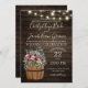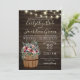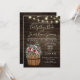 Tonneau de vinho rústico e rosas borgonha sobre madeira de celeiro escura e iluminação de corda design. Convite de casamento rústico e elegante com fontes e texto editáveis.