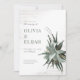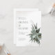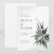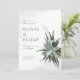 Estes convites de casamento de 5" x 7" apresentam um buquê suculento com sotaques de flor secos em um fundo de textura meteorológica. Os acionistas começam com, "Por favor juntem-se a nós para o casamento de", os nomes dos casais de casamento, data e hora, local com endereço e, "recepção a seguir."
