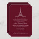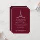 Adicione um toque de Paris à sua quinceañera com este convite para na moda. Ele apresenta uma ilustração desenhada manualmente da Torre Eiffel em frente a um céu noturno estrelado em um fundo burgundy.