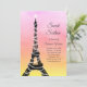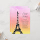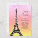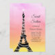 Luzes cintilantes acenam a Torre Eiffel em um fundo de aquarela em tons de rosa, coral e amarelo, fazer este doce parisiense de 16 convidados perfeitos para o partido inspirado em Paris.