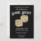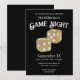 Estes convites de festas personalizados apresentam um tema da noite de jogos. Uma imagem de jogar dados é impressa no centro, em um design de brilho dourado sobre fundo preto. A frase "Noite de Jogo" é impressa acima dos dados com um nome de família de amostra. Você pode personalizar os convites de festas de jogos para incluir seu próprio nome personalizado ou texto.