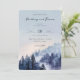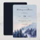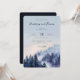 This wedding invitation features a serene, nature-inspired design with a vertical layout that transitions from a soft blue sky to a misty forest scene. The color palette includes calming blues and purples blending into darker greens and blacks, creating an ethereal atmosphere. The watercolor art technique gives the design a gentle, dreamlike quality, while the typography combines elegant script and serif fonts for a romantic touch. Perfect for couples who appreciate natural beauty, this invitation sets a tranquil and inviting tone for their special day.