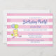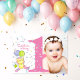 Celebrando um com numeral rosa um, esguicho pastel confetti e gatinho andando em dois balões. Modelo de foto feito para você. Lado inverso cor-de-rosa e branco com detalhes do modelo da festa.