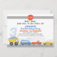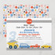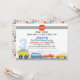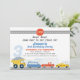 Boys Vehicle Transport Themed Birthday Invitation Transport O convite temático de aniversário com alguns veículos coloridos, um grande número, letreiro vermelho, estradas e prédios. Este convite de aniversário de temas de transporte pode ser usado em qualquer idade.