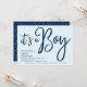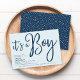 Celebrar a futura mãe ou os futuros pais com este convite para o Chá de fraldas na moda com as palavras "É um Menino" em um roteiro de pincel azul moderno contra um fundo azul claro. A placa tem um padrão vermelhos e brancos esfolados no lado traseiro. Personalize-o substituindo o texto do marcador de posição. Para obter mais opções, como alterar a fonte e seu tamanho/cor ou o espaçamento entre letras, clique no botão "Personalizar". *Observe que a Marca d'água do Zazzle que aparece na visualização de zoom NÃO aparecerá no produto impresso final. © Rosewood e Citrus