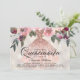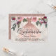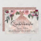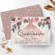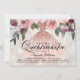 Convite floral moderno para Quinceañera. Design com um vestido rosa de ouro, elementos florais sobre fundo pérola brilhante. Personalize com os detalhes do partido em letra de tendências.