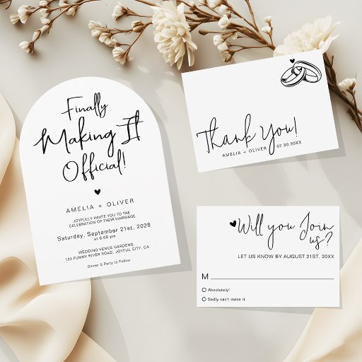 This modern wedding invitation features a trendy handwritten script with the phrase “Finally Making It Official!”.