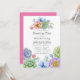 Chá de panela a longa distância de cor d'água vibrante por convite por correio com flores rosa e roxo, suculentes e folhas de eucalipto.