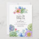 Convites de aniversário de aquarelas vibrantes, com flores, suculentes e folhas de eucalipto, cor-de-rosa e roxas.