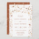O padrão terrazzo da Tendy Earth, convite de casamento. Design de padrão moderno de pedra artística em uma paleta rústica de cor chica de terracota, ferrugem e bege arenoso. Modelo no estilo design de tipografia simples e elegante na coordenação de fontes coloridas de terracota. A placa apresenta cor laranja de ferrugem e padrão terrazzo correspondente.