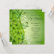 Convites chiques do Dia de São Patrício com muitos trevos e trabalho de roldanas brancas e verdes em um fundo gradiente verde.