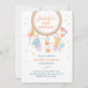 Loja de sonhadores tribal boêmia com miçangas e penas em cores suaves. Algumas miçangas soltas espalhadas no fundo. O primeiro convite de aniversário de um bebê neutro em termos de gênero. A parte traseira da placa apresenta faixas coloridas correspondentes. O texto é totalmente editável.