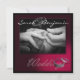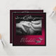 Uma troca de anéis em fotografia a preto e branco com fundo vermelho escuro. Destacados em um canto estão bandas de casamento impressionantes de platina com a palavra "Casamento" como texto de script de caligrafia embutido ao redor do banda