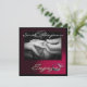 Uma troca de anéis em fotografia a preto e branco com fundo vermelho escuro. Destacados em um canto estão as impressionantes bandas de casamento platinum com a palavra "Engaged" como texto de script de caligrafia embutido ao redor do banda