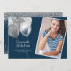 Chá/porta-malas elegante e divertido da faculdade em azul marinho com brilho prateado e balões. Personalize adicionando sua foto e informações da festa.
