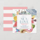 This cute "all I sea is love" bridal shower invitation features a white background with a beach umbrella, flip flops, tropical mason-jar drink/cocktail, popsicle, watermelon, donut, pineapple, straw hat, fresh coconut drink, pinwheel and sunglasses. The reverse side features a white background with pink stripes. Personalize it for your needs. You can find more matching products at my store.