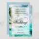 This beautiful wedding invitation features a beautiful watercolor landscape background of a tropical beach with palm trees and pristine ocean waters. It includes fancy script lettering with an elaborate flourish decorating the word "wedding". Simple, stylish, and glam, this invitation is a lovely way to invite your friends and family to share in your joy on your special day. The cool hues of teal, turquoise, aqua, blue, and green make it perfect for an island or coastal ceremony.