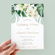 Abundante verde tropical agrupado com orquídeas brancas de aquarela para este design de convite a Chás de casamento inspirado na selva. Todo o texto é personalizável para suas necessidades.