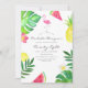 Qualquer convite de aniversário etário com folhagem e flores tropicais exóticas, frutas frescas, uma tipografia com letra flamingo e Trendy.