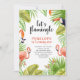 Convite moderno de primeiro aniversário com o título "Vamos flamingle" junto com água pintada de verde tropical, flamingos cor-de-rosa, beija-flor e tucano. Este aniversário de criança é excelente para uma celebração de verão.