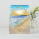 Uma cena de praia tropical que pode estar em qualquer lugar que você esteja segurando seu casamento. Fundo de aquarelas com sol, areia e ondas delimitadas por uma estrutura geométrica dourada.