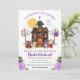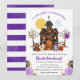 Cóstia Cóstia Cóstia Trick ou Treat Halloween design com animais de casinha, urso, raposa, cão e guaxinim assombrados em fantasias, um fantasma e flores roxas e pretas