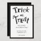 Um design simples e divertido com "Trick or trata" em uma mistura de fontes divertidas em um esquema monocromático de cores preto e branco. Cada letra é embelezada por ilustrações de halloween como aranhas, teias de sabugo, chifres do diabo, morcegos e uma abóbora. Abaixo, há espaço para você preencher os detalhes da sua festa em preto. No verso, há mais espaço se você quiser incluir detalhes sobre o menu da sua festa ou as instruções para o seu local e informações de RSVP.