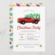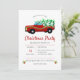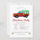 Convites de férias divertidos com um caminhão vermelho coberto de luzes, carregando em casa uma árvore de Natal. Holly sotaque e padrão festivo de mitten nas costas. Fácil personalização para uma festa de na moda.