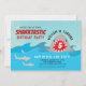 Este convite de aniversário de garotos oferece um tema de tubarão design. A design apresenta uma boca grande de tubarão e dentes acentuados por ondas de água azul. A idade da criança é dentro da boca dos tubarões.