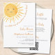 Você está planejando um chá de fraldas temático? Este belo convite para o chá de fraldas de sol de boho apresenta o texto "Nosso pequeno raio de sol está quase aqui!" com uma aquarela sorrindo o sol amarelo. A parte traseira tem solicitações de fralda e livro e um código QR integrado que você pode alterar para vincular diretamente ao registro. Perfeito para um chá de fraldas neutro em termos de gênero. Facilmente personalizável. Original Watercolor © Michele Davies.