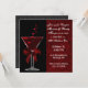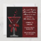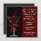 Um vidro sangrento de martini, com um arco vermelho grande, grupo em um fundo preto, destaca este convite de festas do estilo do gótico. Um damasco do vermelho e do preto projeta para a área de texto, no lado direito do convite, tem o texto customizável branco. Personalize todo o texto para seu partido do Dia das Bruxas.