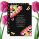 Tulipas editáveis e borboletas Convite para brunch. Design apresenta conjuntos vibrantes de tulipas cor-de-rosa, amarelas e laranja sobre fundo preto. Borboletas cor-de-rosa e amarelas em torno das tulipas, melhorando a alegre estética com um toque caprichoso! O verso do convite é decorado com um padrão colorido de tulipas e borboletas. Personalize o texto e altere o estilo e a cor da fonte para se adequar.