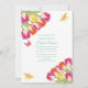 Tulipas editáveis e borboletas Convite para brunch. Design apresenta conjuntos vibrantes de tulipas cor-de-rosa, amarelas e laranja sobre fundo branco. Borboletas cor-de-rosa e amarelas em torno das tulipas, melhorando a alegre estética com um toque caprichoso! O verso do convite é decorado com um padrão colorido de tulipas e borboletas. Personalize o texto e altere o estilo e a cor da fonte para se adequar.