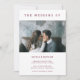 Este convite de casamento simples e elegante apresenta um texto moderno e cor de burlu num fundo branco chico. Há espaço para duas fotos pessoais, uma na frente e outra nas costas.