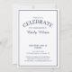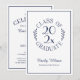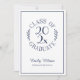 Envie convites de formatura elegantes para a celebração do seu graduado apresentando um emblema de tipografia em azul-marinho chique sobre fundo branco que diz: GRADUADO DA TURMA DE [ANO] com as palavras curvando-se em torno do ano no meio com folhas botânicas curvas ao longo de cada lado do desenho circular. Abaixo do emblema está o nome do graduado em uma fonte de script azul escuro e sua escola em uma fonte serifada elegante. Um retângulo azul-marinho fino cria uma borda perto da borda.
