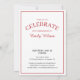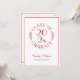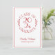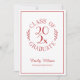 Envie convites de formatura elegantes para a celebração do seu graduado apresentando um emblema de tipografia vermelho em branco que lê: GRADUADO DA TURMA DE [ANO] com as palavras curvando em torno do ano no meio com folhas botânicas curvas ao longo de cada lado do desenho circular. Abaixo do emblema está o nome do graduado em uma fonte de script vermelha e sua escola em uma fonte serif elegante. Um retângulo vermelho fino cria uma borda perto da borda.