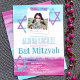 O convite do Bat Mitzvah colorido com turquesa, aqua, rosa e trabalho de arte de brilho roxo. Foto quadrada bonita com estrela de David trabalho de arte sobre fundo colorido de textura é um olhar festivo para a celebração do seu morcego mitzvah. A legenda fotográfica pode ser alterada para qualquer texto que você escolher. Carregue facilmente sua foto no quadro da foto. A fita cola dá a este taco mitzvah um convite estético.