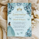 Este adorável convite da quinceañera mostra uma fronteira de flores de aquarela turquesa em um fundo de turquesa pálido. Uma tiara de ouro, uma menina de cabelo escuro em um vestido de princesa turquesa e pequenas borboletas turquesas decoram o texto. A palavra "Quinceañera" e o nome do convidado de honra aparecem num elegante guião dourado, com o texto remanescente na fonte serif cinza.