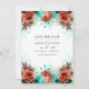 Rosas de cor d'água turquesa e coral e casamento de folhagem iridescente salvam a data projetada para ser rápida e facilmente personalizada de acordo com as especificações do seu evento.