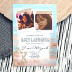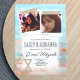 O convite do estilo Scrapbook B'nai Mitzvah com turquesa, ciano, fundo bege siena é perfeito para o anúncio duplo do morcego mitzvah de uma menina. Fotos quadradas bonitas com estrela de David trabalho de arte sobre um fundo de textura único é uma na moda para a celebração do seu duplo morcego mitzvah. As legendas das fotos podem ser alteradas para qualquer texto que você escolher. Carregue facilmente suas fotos nos quadros de fotos. Dourada fita de brilho dá a esta garota um convite de estética de álbuns.