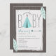 Um convite de chá de fraldas moderno que ilustra uma tartaruga-de-chevron-tipi, uma seta e penas. O fundo é inspirado na madeira. Personalize o texto.