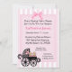 Gêmeos Bebê Choreiros convites para meninas Um fundo de listras rosa com bebês gêmeos sentados em um carrinho de bebê Use nossa modelo fácil para personalizar seus convites para o chuveiro do bebê com seus detalhes de festa.