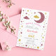 Este belo e elegante convite para o primeiro aniversário de uma pequena estrela cintilante e cintilante apresenta um fundo branco com estrelas brilhantes douradas e cor-de-rosa, lua e nuvens. O design do verso é um dourado falso alternado e listras brilhantes cor-de-rosa.