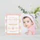Este adorável convite de aniversário apresenta listras brancas e cor-de-rosa com sotaques dourados. Adicione uma foto da sua pequena para completar a design. Perfeito para uma festa tematizada de uma pequena estrela cintilante. Personalizar para qualquer idade.